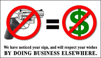 You can help get rid of these misguided signs by politely asking to speak to the owner of the business. Explain to them that by creating a gun free zone, the are actually creating a less safe place for their customers and their employees. Criminals with guns don’t obey “No Guns” signs.